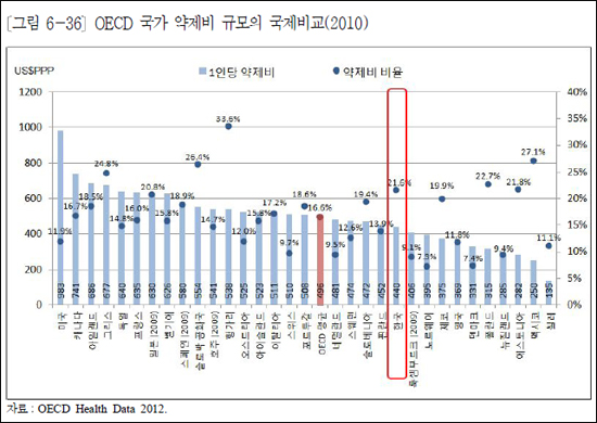 '1인당 약제비' 수준은 OECD 국가보다 낮았지만 증가율은 그렇지 않았다. 실제 OECD 국가들의 2000~2009년 '1인당 약제비' 실질증가율은 연평균 3.5%였다.