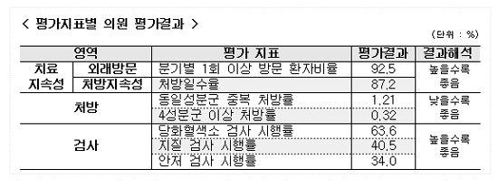 세부적으로는 치료지속성 영역에서는 전체적으로 평가결과가 85%를 넘어 지속 관리가 잘 이뤄지고 있는 것으로 나타났다. 처방영역도 1% 내외 수준으로 99%의 처방이 적절하게 이뤄진 것으로 평가됐다.
