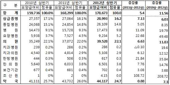 종합병원의 점유율 비중은 2010년 15.1%에서 2012년 14.6%로 0.5%p 줄었지만 이 기간동안 급여비는 8.35% 늘었다.