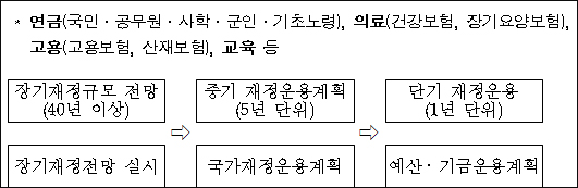 세부적으로는 장기재정전망은 40년 이상 장기재정 규모를 예측하고, 5년 단위로 중기 국가재정운용 계획을 수립한다.