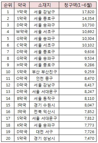 - 올 상반기 청구액 100대 약국…월 청구액 10억이상 32곳