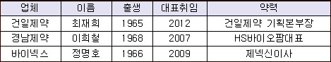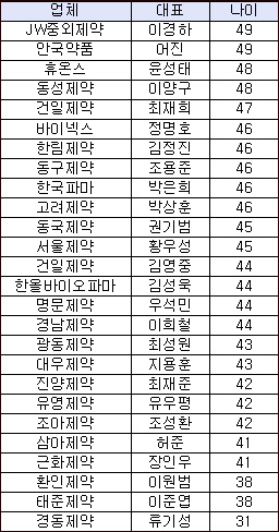 환인제약 이원범 대표(38), 근화제약 장인우 대표(40), 경동제약 류기성 대표(31) 등은 30대 CEO로 향후 회사 경영을 책임질 것으로 보인다.