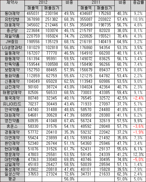 국내제약 상위 30곳 중 무려 25곳이 작년 상반기보다 매출원가 비중이 증가했기 때문이다.