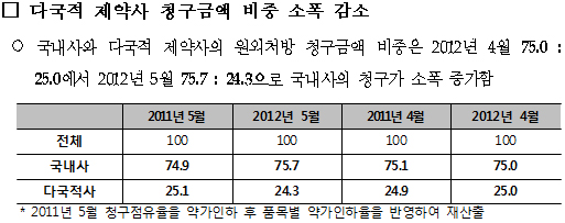 국내사와 다국적사간 비교에서는 청구금액 비중은 4월 75.0 대 25.0에서 5월 75.7 대 24.3으로 나타났다. 약가인하 이전 가격으로 청구금액을 환산한 비교였는데 국내 제약사 금액 비중이 소폭 늘고, 다국적사 제품은 감소했다.