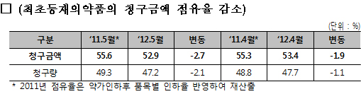 통상 오리지널 제품으로 불리는 최초 등재의약품의 청구내역 비교에서도 오리지널 의약품은 2011년 5월 55.6%에서 올해 5월 52.9%로 점유율이 2.7% 축소됐다.