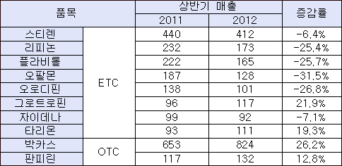 제네릭 공세가 본격화 된 오팔몬’도 상반기 128억원대 실적으로 지난해와 비교했을 때 무려 31%나 떨어졌다.
