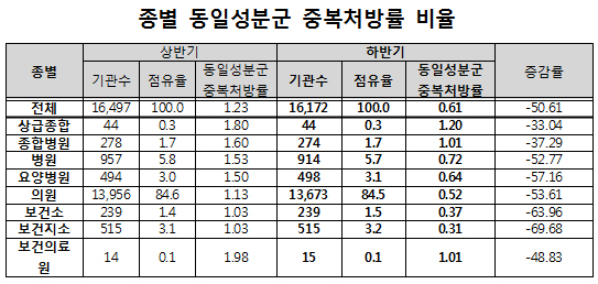상반기 동일성분군 중복처방률은 전체 평균 1.23%로, 보건의료원이 종별 최고인 1.98%를 기록했지만 하반기 보정작업을 거친 후 집계한 결과 보건의료원과 종합병원이 1.01%로 같았으며 상급종병이 1.2%로 나타났다. 그 외 나머지 종별 의료기관들은 소수점 밑으로 떨어졌다.