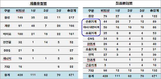 질환분야별로는 종양(122개)과 순환기계(89개), 대사/내분비계(86개), 소화기계(53개), CNS(52개), 감염계(40개) 등이 주류를 이뤘다.