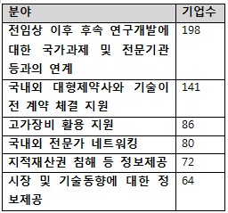 하지만 센테에서 전임상 이후의 사업에 대해서는 지원이 없는 것으로 나타나 기업들은 후속 연구개발에 대한 국가과제와 전문기관 등과의 연계를 필요로 하는 수요가 높았다.
