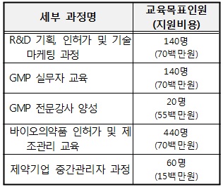 정부가 지원하는 분야는 ▲R&D 기획·인허가 및 기술마케팅 과정(140명) ▲GMP 실무자 교육(140명) ▲GMP 전문강사 양성(20명) ▲바이오의약품 인허가 및 제조관리 교육(440명) ▲제약기업 중간관리자 과정(60명) 등이다.