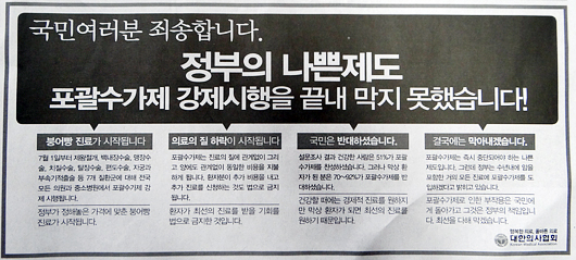 의협은 조선일보 A31면 하단 광고를 통해 "국민여러분 죄송합니다. 정부의 나쁜제도 포괄수가제 강제시행을 끝내 막지 못했습니다"고 사과했다.