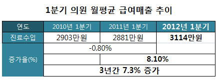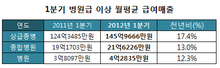 건강보험심사평가원(원장 강윤구)이 2일 공개한 '2012년 1분기 진료비통계지표'를 바탕으로 데일리팜이 3년 간 의원급 월 평균 진료매출 추이와 병원급 이상 월 평균 진료매출을 산출한 결과 이 같이 나타났다.