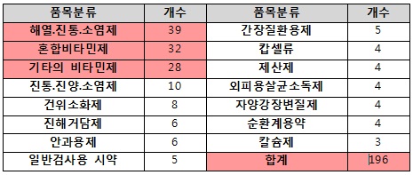 단일 품목분류에서 해열·진통·소염제가 39건으로 가장 많은 수를 차지했으나, 혼합비타민(32개)·기타비타민제(28개) 등을 합할 경우 60건 이상이 비타민군이었다.