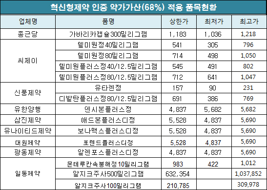 종근당 가바리카캡슐300mg(1183원), 신풍제약 디발탄플러스정80/12.5mg(691원)과 유타렌정(157원) 등도 68% 약가 가산을 받아 상대적으로 높은 가격에 등재된다.