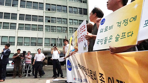 한편 의협 기자회견과 동시에 의협 회관 앞에서 시민사회단체인 '내가 만드는 복지국가(공동위원장 오건호)'가 의사 진료거부 철회운동을 진행했다.