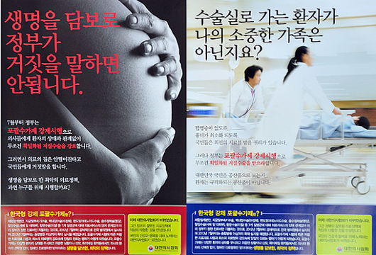 의협은 포스터를 통해 "생명을 담보로 정부가 거짓을 말하면 안 된다"며 "정부는 7월부터 포괄수가제 강제시행으로 의사들에게 환자의 상태와 관계없이 무조건 획일화된 저질수술을 강요하면서 의료의 질은 안 떨어진다고 거짓말을 하고 있다"고 주장했다.
