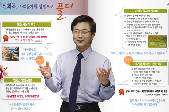 의정활동 중 가장 보람된 일 중 하나로는 '원희목법'으로 불리는 제약산업육성법 제정을 꼽았다.