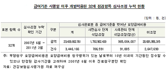 이를 근거로 감사원은 2009년부터 2011년 3월 사이 급여기준 시행일 이후 개발 또는 적용된 전산심사 154개 항목 중 입원환자 식대점검 등 32개 항목을 표본으로 2007년 6월부터 2011년 2월까지 심사 사후관리 실태를 점검했다.