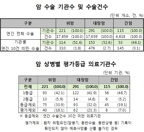 평가 결과 의료기관 별 수술건수 편차가 큰 것으로 나타났다. 연간 3대 암 수술건수가 10건 미만인 곳이 위암 51.6%, 대장암 52.6%, 간암 46.1%로 평균 50%대 수준으로 집계돼 이를 방증했다.