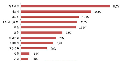 화장품을 취급 중인 약국의 가장 많은 약사는 탈모예방 제품(18.5%)을 꼽았다. 또 아토피(14.6%)·여드름(12%)·비듬치료와 예방(11.7%)·색조(11.4%) 제품 등이 뒤를 이었다.