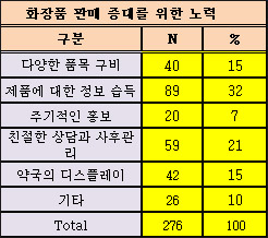 한편 약국에서의 화장품 판매 증대를 위해 약사들이 자체적으로 노력해야 할 부분을 묻는 질문에는 '제품에 대한 정보습득(32%)'이 가장 많았고 '친절한 상담과 사후관리(21%)'가 그 뒤를 이었다.