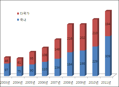 식약청이 공개한 임상시험 승인 통계현황을 보면 2006년 108건이던 다국가임상시험은 작년에는 194건으로 거의 두 배 이상 늘었다.
