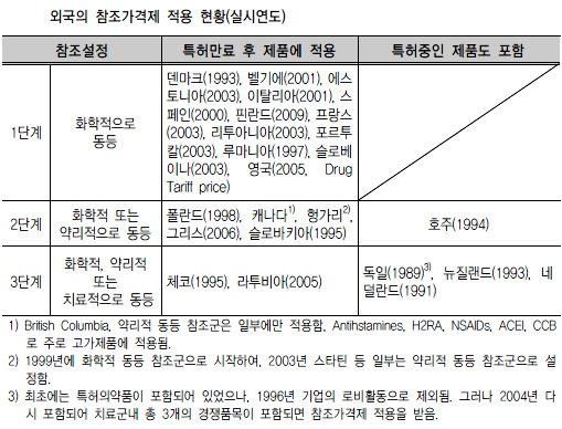 외국이 적용하고 있는 참조가격제 분류기법은 크게 화학적 동등성(1단계), 화학·약리적 동등성(2단계), 화학·약리·치료적 동등성(3단계) 정도로 구분할 수 있는데, 우리나라의 경우 약가 일괄인하 시행으로 인해 1단계 적용은 실효성이 없다.