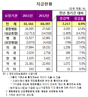 요양병원을 포함한 병원급도 비슷한 수준인 11.6% 증가한 1조2861억원의 급여비를 지급받았다.