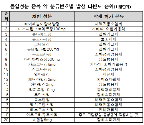 상위 20개 품목을 집계한 결과 해열진통제인 타이레놀이알서방정과 순환계용약인 아스피린프로텍트정100mg, 진해거담제 슈다페드정, 코데날정, 뮤테란과립200mg, 효소제제 뮤코라제정이 가장 많이 중복처방된 것으로 나타났다.
