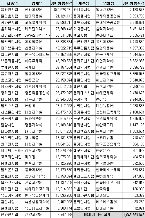 3월 출시한 움카민 제네릭은 모두 63품목(63개 업소). 이 가운데 한미약품이 1억2112만원으로 선두를 달렸다.