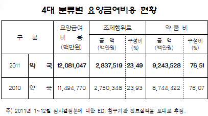 반면 약품비의 구성비는 지속적으로 늘어 2009년 75.67%, 2010년 76.07%에 이어 76.51%를 기록해 대조를 이뤘다.