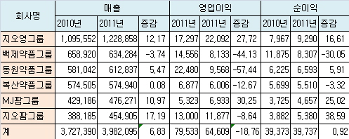 전라남도 순천과 인천지역 진출에 힘입은 지오팜도 6개 대형업체 가운데 가장 높은 성장률을 앞세워 MJ팜을 맹추격했다. 지오팜은 지난해 17.19% 성장한 4549억원 기록했다.
