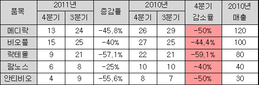 이 시장 리딩품목인 한미약품 '메디락'은 급여제한이 시작된 지난 4분기 13억원대 매출을 올려 전년 동기와 견줘 50% 감소했다.
