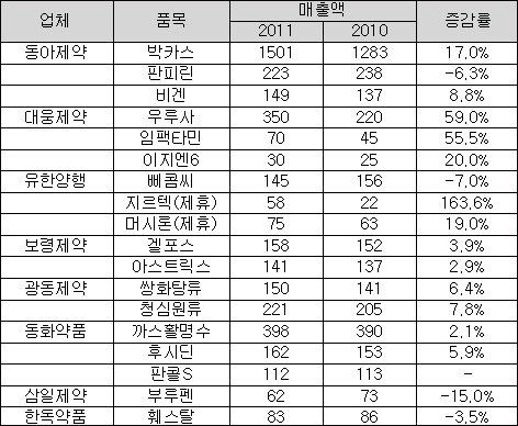 대웅측은 고함량비타민 제품인 '임팩타민'(55% 성장)과 진통제 '이지엔6'(20% 성장)까지 모두 실적 상승을 이끌어내 일반약 시장에서 혁혁한 성과를 올렸다. 일반약 분야에서 두각을 보이고 있는 동화약품도 대표 다빈도 품목들이 지난해 보다 실적이 올랐다.