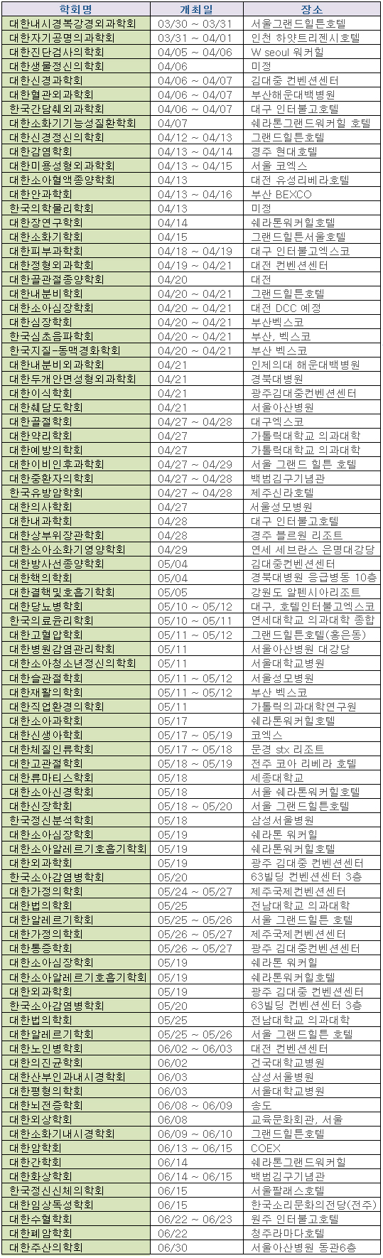 춘계학술대회는 대부분 4, 5월에 집중됐으며 안과학회, 내과학회, 간학회, 소화기학회, 피부과학회 등 대규모 학회는 4월에 집중된 것으로 분석됐다.