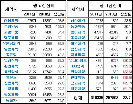 광고선전비를 가장 많이 늘린 제약사는 대웅제약으로 이 회사는 2010년 대비 무려 106.6% 늘어난 276억원을 투입했다.
