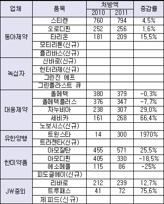 대신 일괄인하가 이뤄지지 않은 '스티렌' '오로디핀' '타리온' 등 기존 품목 육성에 주력한다.