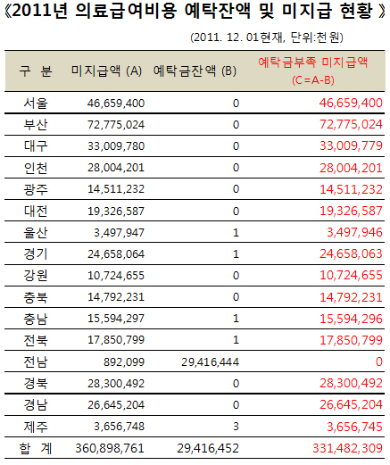 유일하게 전남지역만 미지급액 없이 의료급여 예탁급이 운영돼 눈길을 끌었다.