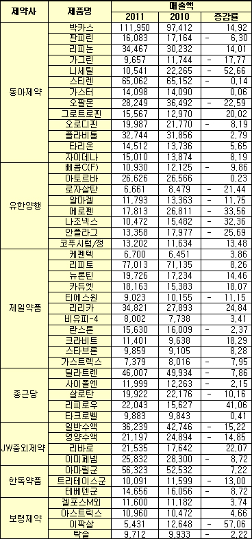 제약사별 대표품목 올해 매출, 줄줄이 떨어졌다