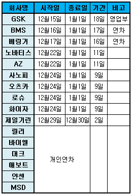 화이자, 아스트라제네카 등 다국적제약사의 경우 연말을 장기간의 휴무로 보내는 본사의 정책에 따라 크리스마스를 전후해 휴무가 시작된다.