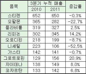 2위 품목 ‘오팔몬’의 행보도 무겁다. 3분기 누적 매출이 282억원으로 지난해(365억원)보다 무려 23%가 줄었다. 제네릭 공세와 영업환경 위축이 실적 하락의 주 요인으로 분석된다.