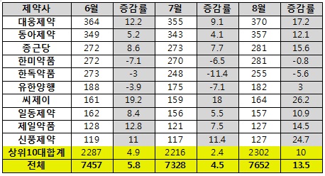 반면 한미약품은 8월 조제액은 전년 대비 0.8% 감소해 10대 상위 업체 중 유일하게 역신장을 기록했다.
