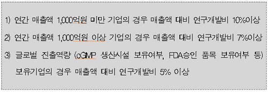 연간 총 매출액이 1천억원 이상인 기업은 매출액 대비 7%, 1천억원 미만 기업은 10% 이상의 연구개발비를 투자하면 된다. 또 cGMP 생산시설을 갖고 있거나 FDA 승인품목을 보유하고 있는 등 글로벌 진출역량을 갖춘 제약사는 매출액 대비 연구개발비가 5%이상이면 조건을 충족한다.
