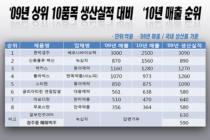 데일리팜은 2009년도 상위 10품목 생산실적(식약청 자료)을 기준으로 2010년도 제품별 매출을 분석한 결과, 1·2위는 2500억·1560억원을 기록한 퀸박셈주와 신종플루 백신인 것으로 나타났습니다.