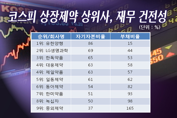 코스피 상장 제약사 중 재무 건전성 1·2·3위는 유한양행·LG생명과학·한독약품으로 각각의 자본율은 86·69·65%입니다.