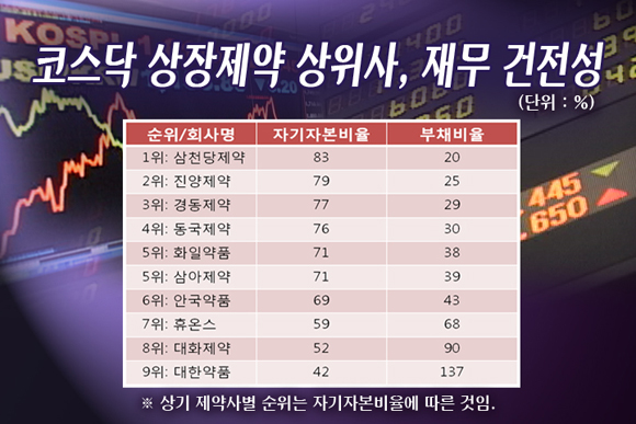 4·5위에 랭크된 대웅·제일약품과 한미약품의 자본율도 63·61%로 평균치인 59%를 웃돌았습니다.