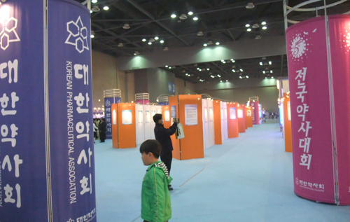 이와 달리 제약업체 등의 부스에는 약사들이 길게 줄을 서 각종 제품들을 둘러보는 등 대성황을 이루고 있다.