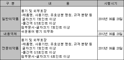 표시지침 제정안의 주요 내용은 외부 포장 및 용기의 글자크기는 7포인트 이상, 줄간격은 0.5포인트 이상으로 기재하고, 첨부문서는 일반의약품 7포인트, 전문의약품 6포인트 이상으로 기재토록 하고 있다.