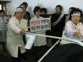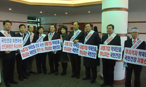 특히 조찬휘 약사회장 후보와 김순례 경기도약사회장 후보는 공청회장 입구에서 대기업에 약사들이 포획돼 끌러가려는 퍼포먼스를 통해 선진화 방안에 대한 반대 목소리를 전달해 눈길을 끌었다.