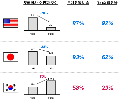 고 연구원은 따라서 "국내 도매업계도 업체간 업무, 자본 제휴와 자회사화, 인수합병 등을 통한 경쟁력 강화하 시급하다"고 진단했다.